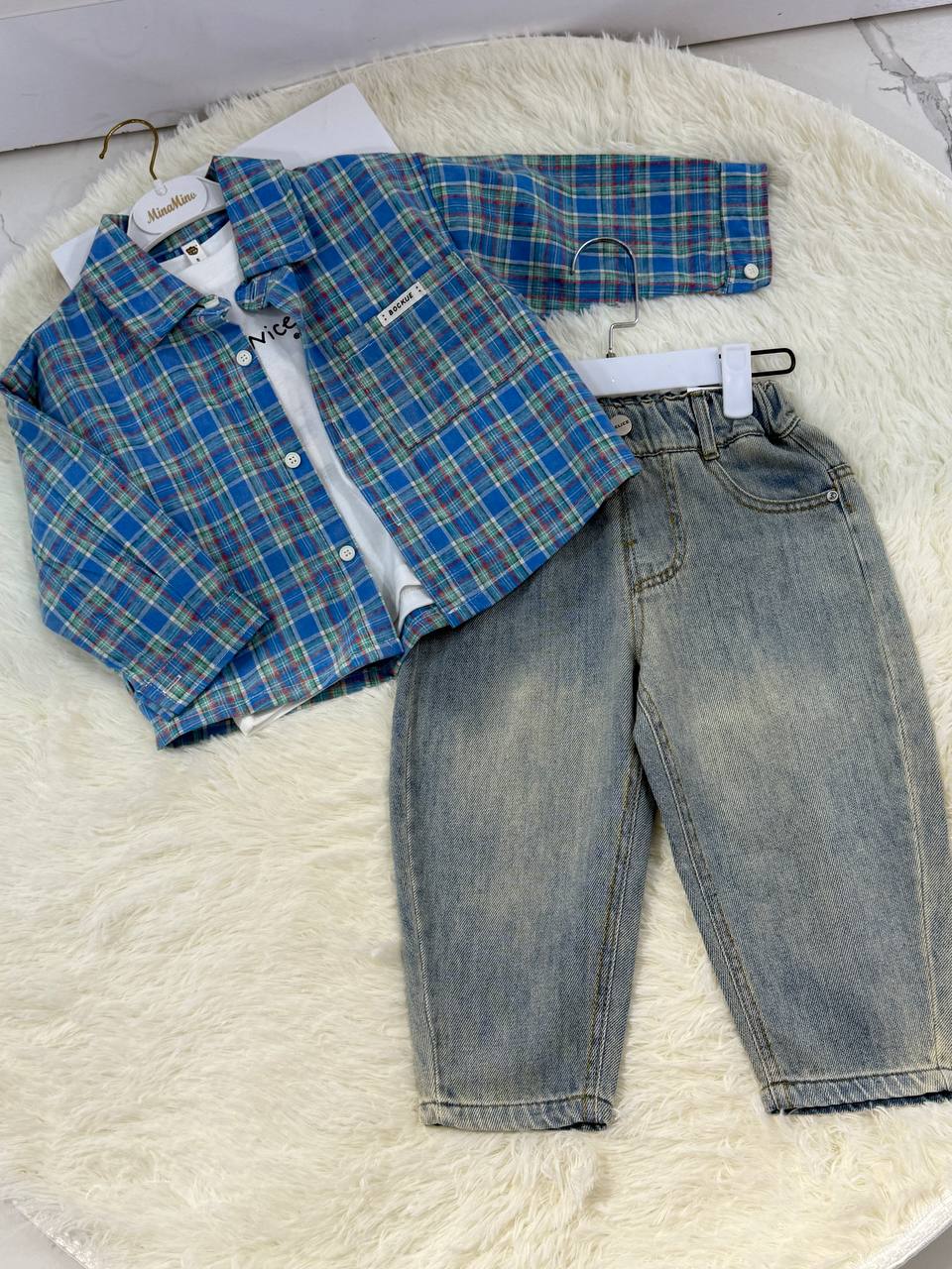Рубашка в клетку - универсальный акцент. Светлые джинсы с легким эффектом потертости. Базовая футболка с лаконичной надписью.